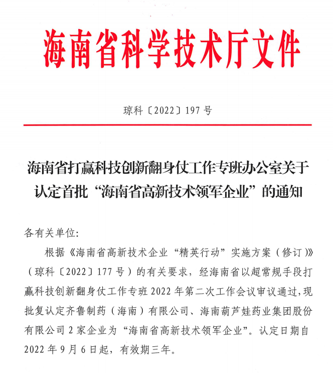近日,海南省科学技术厅发布的《海南省打赢科技创新翻身仗工作专班办公室关于认定首批“海南省高新技术领军企业”的通知》中显示,批复认定海南尊龙凯时药业集团股份有限公司等2家企业为“海南省高新技术领军企业”。认定日期自2022年9月6日起,有效期三年。